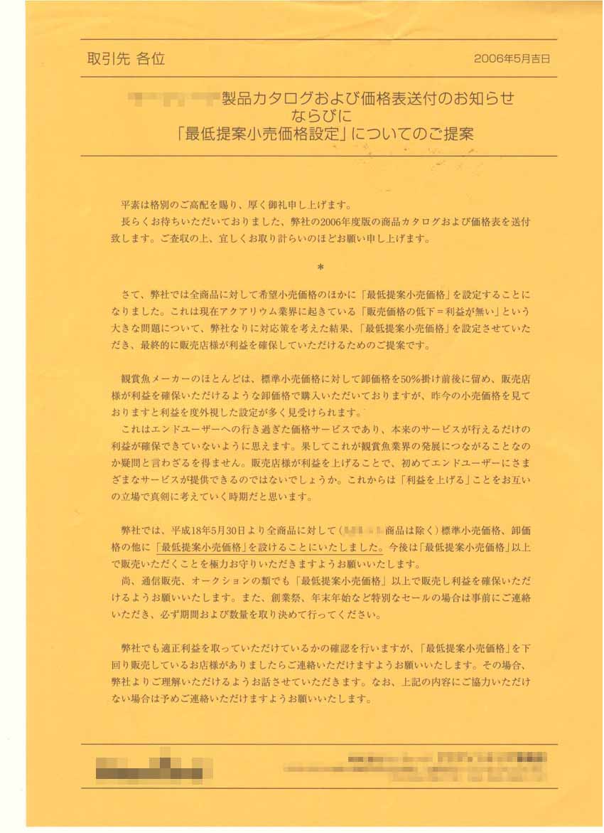 そういえば3年ほど前にも、不況のアクア業界でブランドイメージの確立に成功して、唯一勝ち組のアクアメーカーであるA社も左のような書状を出して話題になりました。