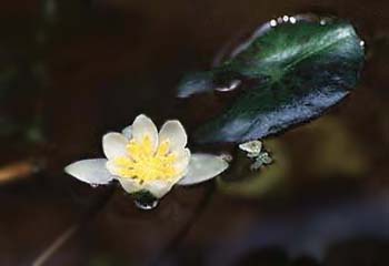 | [スイレン科スイレン属] シーズンになると園芸店などでも小さなポットで販売されています。睡蓮では日本のただ一つの在来種(?)のようです。 全国の池や沼に分布していますが、寒さに強く北半球に広く分布しています。直径5cm位の花弁がたくさん(10枚位)ある白い可愛い花を咲かせます。ヒツジグサの語源は開花の時間が昔風の言い方で羊の刻(午後2時)であることに由来しています。 実際は昼ごろから咲き始め夕方4時から5時頃に閉じます。この花は1日花ではなく5−6日咲きます。多くの外来種の睡蓮は逆に早朝より開花し午後2時頃には花を閉じます。 ヒツジグサは、寒さには強く秋になると浮き葉は見事に紅葉し水面を彩ります。種子または根茎で越冬しますが、種子はゴマほどの大きさです。 |