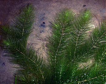 | [マツモ科マツモ属] 普通キンギョモと呼ばれているもののひとつで、松の葉に似ているので松葉藻と呼ばれます。 根が無いので水の中を漂っています。金魚屋さんにはカナダモなどと同じように普通に販売されていて良く見かけます。水槽の中ではとてもきれいな水草です。 |