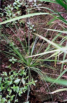 | ミズニラ[ミズニラ科] 名前の通りニラにそっくりです。本州の沼沢地、水田、休耕地、田圃のヘリなどに自生します。自生地では左の写真のように横に広がっていることが多いのですが水槽に入れますと直立して充分鑑賞に堪えます。ミズニラより小さいヒメミズニラが東北地方の月山や八甲田山麓にあるようです。 この水草は、レッドデータブックでは危急種に分類されますが、田圃の畦や休耕田などに大量にあることがあります。漢字で「水韮」と書きます。 ミズニラモドキ 1997年に新種と発表されました(熊本大学)。岡山市の後楽園で初めて観察しましたが、目による観察では通常のミズニラとは区別ができませんでした。 塊茎部の大胞子および小胞子に相違点があるようで顕微鏡による観察が必要とのことです。東北地方の太平洋側、瀬戸内海に面した中国・四国地方に分布しています。 外見上はまったく普通のミズニラですので写真は掲載しませんでした。 |