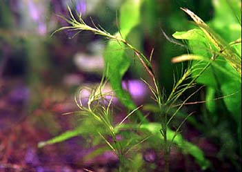 | [イバラモ科イバラモ属] この水草は節々から白い根を出しながら盛んに分岐しながら成長しますが折れやすい草でもあります。このため水槽では取り扱いがやや面倒です。 イバラモ科ですから葉にギザギザ(鋸歯)はありますが、よく見ないと判らないくらい小さく、さらに草全体が柔らかです。草全体はやや茶色っぽく見えることもあります。漢字名のホッスモのホッスはお坊さんのもつ仏具の払子(ほっす)に似ているところからつけられたようです。 |