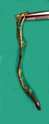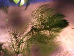 | 日本固有のフサタヌキモの自生地は、従来岩手県の一戸のみとされていたようですが、以下に紹介するのは、96年9月に秋田県で新たに見つかった「フサタヌキモ」です。発見者は秋田在住の知人・佐々木喜久氏です。 このフサタヌキモは大変興味深い特徴を持っています。草体はかなり大きく大型のタヌキモと同じ程度あります。大きな特徴は他のタヌキモ類と比べて草体が非常にしなやかで、かつ、葉を指で触っても感触がないくらいの柔らかさです。草体自体が柔らかなため、(穂先の重さのせいだと思いますが)穂先がすべて水底を向いていて、お辞儀をしたような格好で水中を浮遊しています。 フサタヌキモの特徴として、閉鎖花と捕虫嚢が極めて少ないこ_とがあげられますが、これにもう一つ、ほかのタヌキモと比べて極めて柔軟である、ということがいえるようです。 捕虫嚢のつき方は、同地域(秋田県)で採取されたタヌキモと比較しても圧倒的に少なく、葉の付け根付近に若干(2−4個)見られる程度ですが、これも必ずあるということではなく無い方が多いようです。ただし、数少ない捕虫嚢ですが捕虫嚢自体は決して貧弱ではなく、むしろ一つ一つは大きくしっかりしています。またフサタヌキモの特徴である閉鎖花は明確に見ることができました。 |