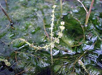 | [アリノトウグサ科フサモ属] 全国各地の溜池や池などのある沈水性の多年草で、種子または根茎で越冬します。フサモにそっくりで花が咲かないと判別が困難です。 ホザキノフサモは写真のように穂状花序をはっきり水面に立ち上げて花が咲きます。フサモは葉の脇に花がつきますがホザキノフサモの花序に葉はありません。 キンギョモ(金魚藻)と別名で呼ばれフサモと共になじみのある草です。この草は枝の途中から脇目を出し増殖します。水槽では成長が早くトリミングが面倒です。オオフサモほどではありませんが寒さにはかなり強いようです。漢字名は穂咲の房藻。仲間にフサモ、オグラノフサモがあります。 |