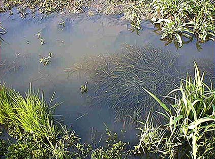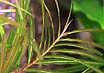 | センニンモ[ヒルムシロ科ヒルムシロ属] 採取地は、市街地のコンクリートで護岸されたかなり流れの速い川で、近くにエビモ、カナダモ、コカナダモなどとともに群れを作っていました。 この草はエビモなどと同じ沈水性ですが水槽に入れたら見事に変身しました。なかなか見応えのある水草です。 自生地では草長が約1mほどでヒルムシロに似た1cmほどの花序をつけていました。葉柄は無く葉は互生し葉の中央脈は明瞭で色はやや褐色。節から白い根を出します。葉の先端は鈍頭で葉縁に鋸歯がまばらについています。 葉の色は採取時は暗緑色でしたが、水槽では写真のような淡黄緑色になりました。採取後しばらく何という水草かわからなかったのですが、知人にセンニンモだと教えていただきました。流れの速いところにも生育するようです。漢字名は仙人藻。 |