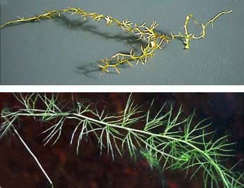 写真上は青森産のコタヌキモ、下は広島産のコタヌキモ。青森産がこじんまりしているのに比べて、広島産は葉が長く多少柔らかな感じです。同じコタヌキモでも比較して見ますとずいぶん違います。写真で見る通り水中の茎には捕虫嚢はほとんどつけません。