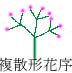 | 多岐集散花序 (たきしゅうさんかじょ) | 集散花序の一種。主軸の頂端に1花を開き、その軸から3個以上の側枝を出し、それぞれの頂端に開花し、順次それを繰り返す花序。サクラソウ、ニチニチソウなど。 |